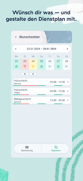 - Kalender dengan pandangan mingguan dan bulanan: daftar, absen, jam kerja, penawaran & informasi shift